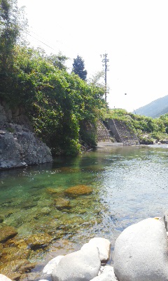 10時過ぎから順調に掛かるようになりました。特に、昼になって休憩で川から人がいなくなると、プチ入れ掛かりが何回かありました。それに加えて、掛かるアユが段々大きくなっていきます。ほとんどがオトリサイズより大きなものばかりです。最大は20cm!! ちょうど向かいの岩盤の手前で掛かることが多かったです。