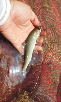 続けて2匹でストップです。掛かった3匹を循環させますが、また長い時間が過ぎます。再度養殖を持って、上流の強い瀬のポイントを探りますがノーヒットです。淵に入る最後の段々瀬でようやく掛かりました。ちょっと大きいです。勢いよく沖に泳ぎその後淵へと泳いで行きました。複合の005を張っていたので、思い切って抜こうとしましたが、ちょっと荷が重い感じです。淵に近づき鼻管糸をつまもうとしましたが、あまりに大きな魚体にびっくりして手を引っ込めてしまいました。再度泳がせて弱らせてからすくい込みました。イワナです。25cmを超えていそうです。胸ヒレに掛かっていました。それにしてもこの手応え、解禁のときの手応えに比べると軽いものです。解禁に掛けたのはいったいどれだけ大きかったのか。。。