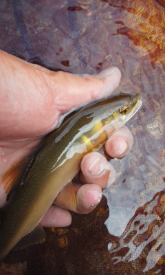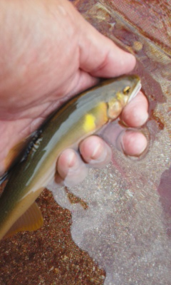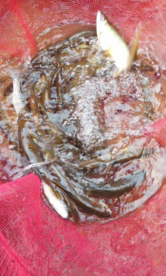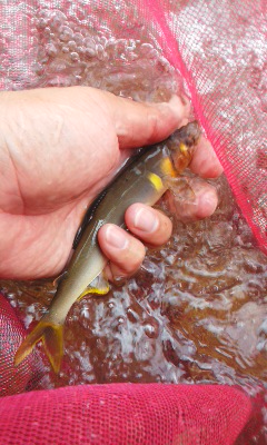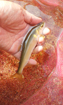 200mほど釣り上がり、堰堤が現れました。ここから先はほとんど掛からず、さらに次の堰堤上は鮎の気配もありませんでした。ここで竿をたたみ、下流の遊泳場に向かいます。遊泳場のすぐ下に草木が生い茂るポイントがあり、ここも竿抜けになっています。底が明るいので必ず掛かると確信していましたが、はやり一発です。これを掛けたのを見ていた人が話しかけてきました。群馬から来たそうで、アユ釣りを初めて間もないようです。今回は野外コンサートに来たため竿の準備をしてこなかったことを大変後悔していました。その人と話している最中にもう1匹掛けました。引き舟の鮎をタモにあけると15匹くらいでしょうか。その人はますます残念がっていました。ここらへんの鮎のことや岐阜県全体のことなど、30分ほど話し込んでしまいました。 そこからさらに200mほど釣り下りましたが、渇水のためポイントが少なく数匹追加したのみでした。昼近くになったため車で小移動です。次のポイントもいつもは必ず竿を出すのですが、鮎の姿が見えません。石も曇っています。30分ほどで見切りを付けて本日は終了としました。
