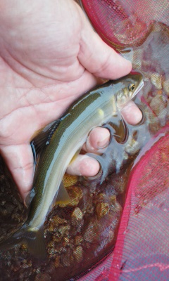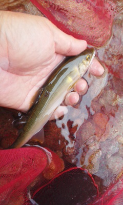 2つ目の堰堤まで来てしまい、ここで竿をしまいます。最初のポイントに戻る途中で鮎の姿が見えるポイントがあり1匹追加。下流でテンカラをしている人がいました。アマゴが出てくるようですが、魚影は少ないそうです。鮎がいるときはアマゴが出てこないと言っていました。その人と別れて、下流の水遊び場に入りますが、1匹追加したのみでした。車で大きく移動して最下流のポイントに入ります。ここで22cmくらいの鮎を追加して午前の部終了。川を変えます。