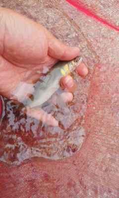 30分ほど運転して、下流から様子を見て行きます。お気に入りのポイントは先週と同じピンクの軽が止まっています。橋の上流にも1人。町中のポイントに入ります。魚影が結構見えます。遠くから静かに石のまわりに入れると一発です。魚体が白く黄色い追い星がきれいな鮎がきました。