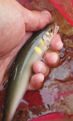 そのまわりでさらに3匹追加して上流に移動します。堰堤下のポイントにずいぶん鮎がたまっています。幅1mも無い流れのポイントに入れると、目印が不自然に動きました。抜き上げると思いのほか大きい鮎が飛んできて目の前でポロリ。おとりと掛かり鮎が30cmくらい離れていて一瞬迷ったため、掛かり鮎を受け損ねてしまいました。ポロリはあったものの、タモで受けることができるところでのキャッチミスです。少々釣りが雑になっていたようです。堰堤上はやはり魚影が相当薄くなります。足早に最後の大型がいるポイントに向かいます。ここで4匹追加して14時に終了です。