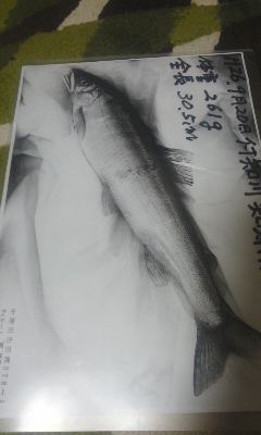 22cmのオトリが小さくみえます。ひょっとしたら尺あるかもしれません。さかさ針が付いた9号くらいの3本いかりが刺さっていました。鼻管糸を切ったということでしょうか。その他に針が刺さった傷跡が3カ所もあります。歴戦のつわものといったところでしょうか。。竿を畳んで喫茶JBで計測してもらいます。30.5cmで261g! 念願の尺鮎です。今シーズン最初のチャレンジで達成してしまいました。