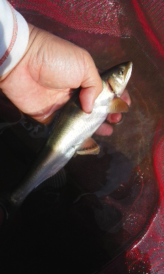 養殖を泳がせて上に上にと移動していきます。群れ鮎の中に入ったところで鋭く目印が水中に入りました。22cmのオトリ頃です。 これをオトリに泳がせますが、掛かりそうでなかなか掛かりません。しばらくしてから引き寄せると針がありません! すっぽ抜けていました。再度養殖の登場ですが、今回の養殖はメスで泳ぎが良いです。群れについて行き、反転したときに2つの魚影が光りました。ちょっと遅れて目印がいっきに上流に移動します。これは23cmのメス。後期放流のオトリ頃のサイズが続きますが、ここまで。もう1匹をタモの直前でポロリしてしまい、それからぱったり。養殖をローテーションしてときどき来る群れ鮎の中に誘導しますが、ついて行けません。午後になると、大きな群れが食みだしました。移動速度は遅いようです。温存しておいた1匹目の掛かり鮎を投入します。群れになじんだところで目印がふわふわと動き、水中に引き込まれます。これは大物です。10回ほど強い引き込みがあり、軟調の竿がしなります。手尻を50cmくらいにしていたので、めいいっぱい竿を高くしてもタモですくえません。付け糸をつまみ、下からすくいました。