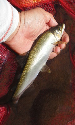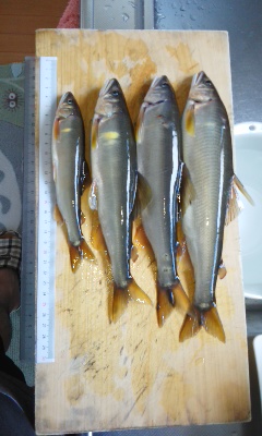 今日もよい天気ですが、日曜日と同様に鮎の姿が少ないです。朝の寒さのせいで落ちたのでしょうか。その後も24cmから26cmの型がぽつりぽつりと掛かります。 気がつくと、回転しながら上に登る2匹の鮎がいます。どんどんこちらに近づいています。オトリ鮎と掛かり鮎のようです。あわててタモを差し出しますが、すくえるわけがありません。と思いきや、石のまわりを1回転してあっさりタモの中に入りました。 今日は4時まで粘って、6匹+2匹でした。朝倉さんが撮影してくれたビデオです。 |
