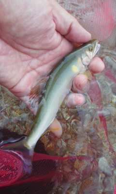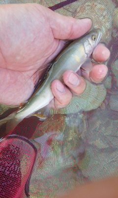 • 同じポイントで粘っても掛かりが遅いので、どんどん上流に向かいます。ゆうさんの旦那さん?と代わりばんこに移動するような感じです。いつも掛かるポイントでは、黄色い鮎が、さらに20cmオーバーも掛かりました。
