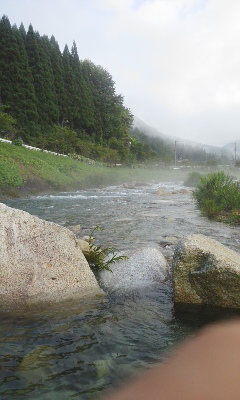 • ホームグラウンドの解禁は18日でした。直前までいく予定をしていましたが断念。気象庁と国土交通省の水位のデータを見ながら、19日はなんとしても行きたいところです。中津川も阿木川ももう少し減ってほしいところです。川上川の水位データはありませんが、昨晩に75mmの雨量を記録していてダメそうです。4時に起きて、阿木川下流はバツ、中津川も濁ってバツ、川上にくると、なんとか出来そうどころか、水も透明。でも下流は誰もいません。上流の道の駅の前にはすでに車が4台。いそいで戻って車屋さんのおとりを買いに行きますが人気がありません。無人販売になっていました。こんなのは初めてです。2匹1000円。道の駅の前にはすでに竿を出している人がいるので次の橋に入ります。一番乗りです。遠くからは竿が出せそうでしたが、近づくと、やはり水位は高めでポイントが少ないです。直ぐに男女2人組が入ってきます。派手な舟を持っている人は、昨年阿木川で会ったゆうさんです。挨拶だけして、直ぐに竿を出します。石裏のゆるい流れにいれて10分。オトリサイズの鮎が掛かりました。こんなポイントですが、下流側で写っているのがゆうさんです。